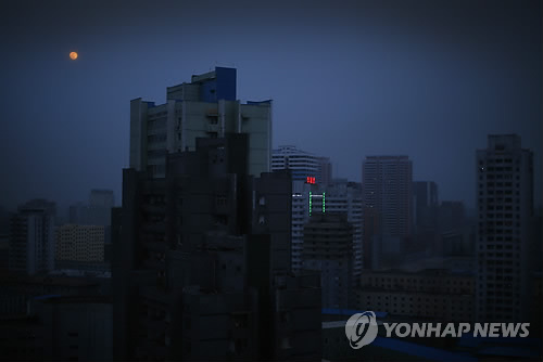 △ 5월 3일 평양의 밤 (평양 AP=연합뉴스) 어둠에 잠긴 평양에 달이 떠 있다. 북한은 노동당 창건 기념일 등 올해 하반기 주요 기념일을 앞두고 20~50%씩 전력생산을 늘리도록 독려하고 있다. 이와 함께 만성적인 에너지난을 완화하기 위해 태양광 등 대체자원 개발을 추진하고 있다. 북한 농촌 많은 지역에서 태양전지를 이용해 전력 생산을 하고 있다. ciy@yna.co.kr In this May 3, 2015, photo, the moon hangs over Pyongyang city which is mostly in darkness, in North Korea. North Korea is racing to boost its electricity supply by 20 to 50 percent ahead of a major anniversary later this year and is pushing alternative resources like solar, which is already used extensively in the countryside, to ease its chronic shortages of energy. (AP Photo/Wong Maye-E)