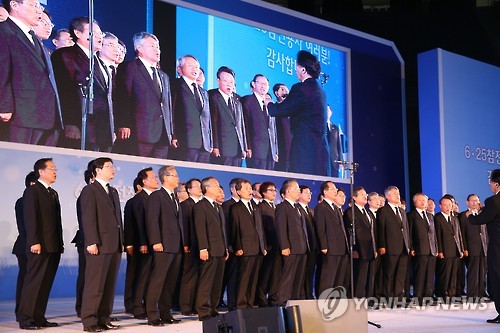 (서울=연합뉴스) 김귀근 기자 = 전직 국방장관과 예비역 장성, 기업인, 가수 등이 참여한 '군가합창단'이 25일 6·25전쟁 제65주년 기념식에서 첫선을 보였다.