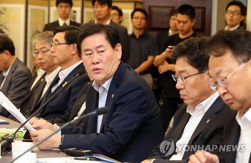 | △ 최경환, 하반기 경제정책방향 설명 (서울=연합뉴스) 진성철 기자 = 최경환 경제부총리가 25일 국회 귀빈식당에서 열린 하반기 경제정책방향 당정협의에서 인사말하고 있다. 오른쪽 부터 유일호 국토교통부 장관, 윤상직 산업통상자원부 장관, 최 부총리, 이기권 고용노동부 장관, 임종룡 금융위원장. |