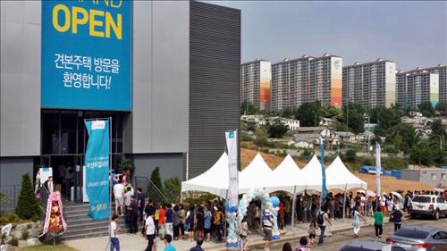 △ 지난 20일 GS건설 옥길자이 견본주택에 몰린 내방객들이 줄을 지어 입장하고 있다. GS건설 제공.
