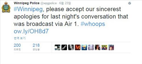 위니펙 경찰은 다음 날 트위터에 '아차'(#whoops)라는 해시 태그와 함께 글을 올려 "지난밤 헬기에서 방송된 대화에 대한 진심 어린 사과를 받아 달라"고 사과했다.