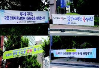 현수막에는 '메르스와의 전투 강동경희대학교병원 전사 여러분 당신을 응원합니다', '환자를 지키는 강동경희대학교병원 직원분들을 응원합니다' 등의 내용이 담겼다.