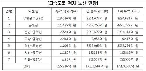 무안광주·88선의 누적 적자액은 3천16억원, 동해선 1천485억원, 순천-완주선 541억원, 고창-담양선 461억원, 익산-포항선 205억원, 서천-공주선 180억원, 서울-양양선 28억원을 기록했다.