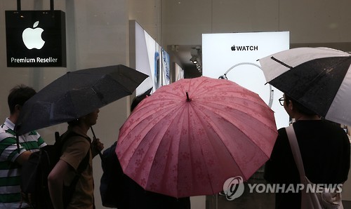 △ 애플워치 사기 위해 빗속 대기 (서울=연합뉴스) 황광모 기자 = 애플이 출시한 '애플워치' 한국 판매 개시일인 26일 오전 서울 명동 애플 기기 판매점인 프리스비 앞에서 시민들이 줄지어 판매를 기다리고 있다.