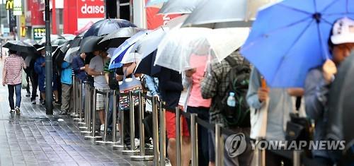 (서울=연합뉴스) 고상민 기자 = 장맛비도 '애플 사랑'을 막지는 못했다.