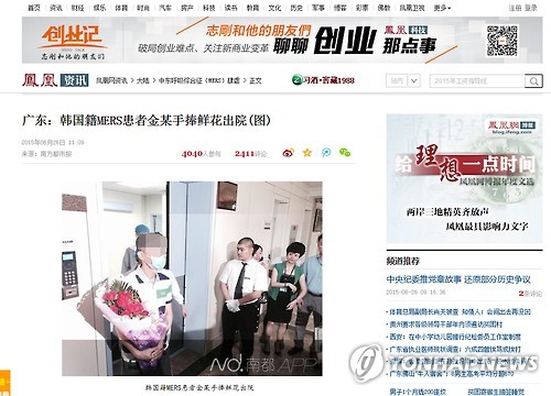△ 중국간 메르스 환자 퇴원 (서울=연합뉴스) 중국에서 치료를 받아오던 국내 10번째 중동호흡기증후군(메르스) 환자 K(44)씨가 완치 판정을 받고 26일 오전 퇴원했다. 보건복지부는 중국 측에서 이 환자의 퇴원 사실을 알려왔다고 밝혔다. 홍콩 봉황망이 이날 광둥(廣東)성 현지 매체인 남방도시보(南方都市報)의 보도를 전재해 K씨 퇴원소식을 알리고 있다. 2015.6.26 << 홍콩 봉황망 캡처 >> photo@yna.co.kr
