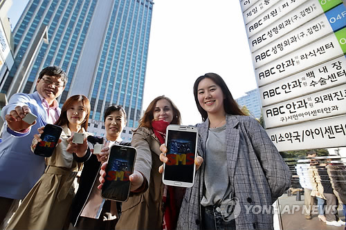 | △ (부산=연합뉴스) 서면메디컬스트리트 의료관광협의회 소속 간호사와 의료고객이 20일부터 다음달 9일까지 선보이는 사물인터넷 서비스 애플리케이션을 설치한 스마트폰을 들고 있다. 2015.4.20 wink@yna.co.kr |