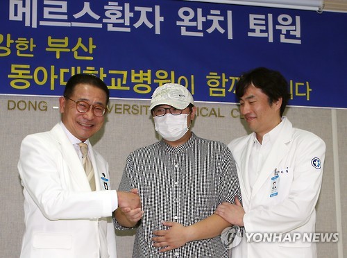 | △ 퇴원하는 메르스 143번 환자 (부산=연합뉴스) 김선호 기자 = 부산의 두 번째 중동호흡기증후군(메르스) 확진자이자 143번 환자인 이모(31·가운데)씨 25일 완치판정을 받고 퇴원하며 김상범 병원장(왼쪽)과 주치의 이혁 교수의 격려를 받고 있다. 2015.6.25 wink@yna.co.kr |