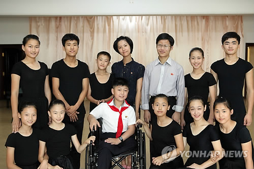 △ 사진은 지난해 8월 평양에서 북한 장애인 학생들이 영국 옥스퍼드대와 케임브리지대 공연앞두고 연습하는 도중 포즈를 취하는 장면. 2015.6.27. << 두라 제공 >>