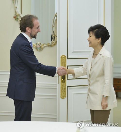 △ 박근혜 대통령이 지난 25일 청와대에서 유엔 북한인권사무소 개소식에 참석하기 위해 방한한 자이드 알 후세인 최고대표와 인사하고 있다. 2015.6.27<<연합뉴스DB>>
