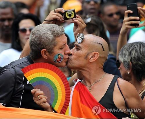 | △ 지난달 9일(현지시간) 쿠바 수도 아바나에서 라울 카스트로 국가평의회 의장의 딸이자 성소수자 인권 운동가인 마리엘라가 개최한 동성애자 권리 신장 이벤트에서 한 동성애 커플이 입을 맞추고 있다.(EPA=연합뉴스DB) |