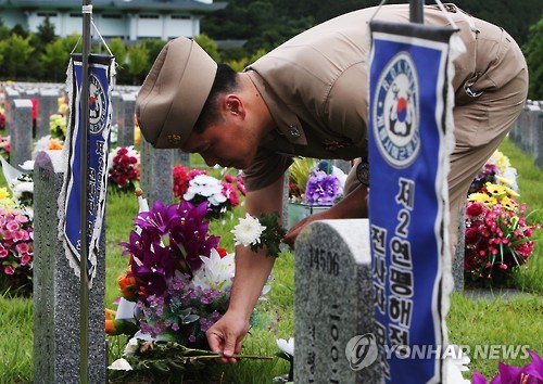| △ 제2연평해전 전사자 묘소 찾은 이희완 소령 (대전=연합뉴스) 이재림 기자 = 제2연평해전 전사장병 13주기를 사흘 앞둔 26일 대전 유성구 국립대전현충원에서 해전 당시 참수리 357호정 부정장으로 임무 수행 중 부상한 이희완 소령이 제2연평해전 전사자 묘소에 헌화하고 있다. 2015.6.26 walden@yna.co.kr |