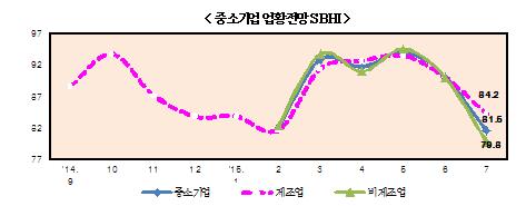 중소기업중앙회는 이달 12∼19일 제조업과 비제조업 업체 2천847곳을 대상으로 조사했더니 7월 중소기업 업황전망건강도지수(SBHI)가 81.5로 지난달보다 8.5포인트 하락했다고 29일 밝혔다.