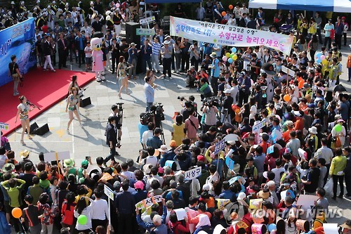 △ '메르스 극복' 부산 경제살리기 인파 (부산=연합뉴스) 조정호 기자 = 28일 오후 부산 사직야구장에서 열린 '메르스 위기 극복 범시민 경제살리기 대회'에 많은 시민이 몰렸다. 서병수 시장은 "올 여름 부산으로 와달라'고 호소했다. 2015.6.28 ccho@yna.co.kr