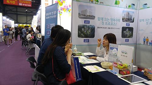 △ 지난 27∼28일 서울 강남구 무역전시장(SETEC)에서 열린 결혼박람회의 행복주택 홍보부스에 관람객이 찾아와 설명을 듣고 있다. 2015.6.29. <<국토교통부>>