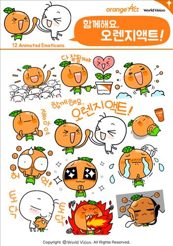 △ (서울=연합뉴스) 국제구호단체 월드비전은 내달부터 오렌지액트 캠페인 후원금을 카카오페이로 결제하면 이모티콘을 무료로 제공하는 서비스를 시작한다고 29일 밝혔다. 사진은 무료로 제공하는 이모티콘. 2015.6.29 << 월드비전 제공 >>