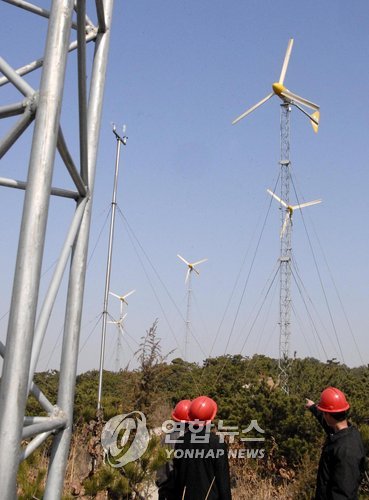 | △ 북한 풍력발전기 (평양 조선중앙통신=연합뉴스) 평안남도 남포시의 영남배수리공장에 건설된 풍력발전기. |