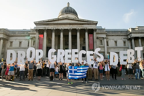△ '그리스 부채를 탕감하라' (런던 AP=연합뉴스) 그리스와 국제채권단의 협상결렬로 그리스의 디폴트(채무불이행) 위기가 고조되는 가운데 유럽중앙은행(ECB)의 구제금융상환 정책에 반대하는 사람들이 29일(현지시간) 영국 런던 트라팔가 광장에서 '그리스 부채를 탕감하라'(DROP GREECE'S DEBT)는 문구를 들고 시위를 벌이고 있다. marshal@yna.co.kr