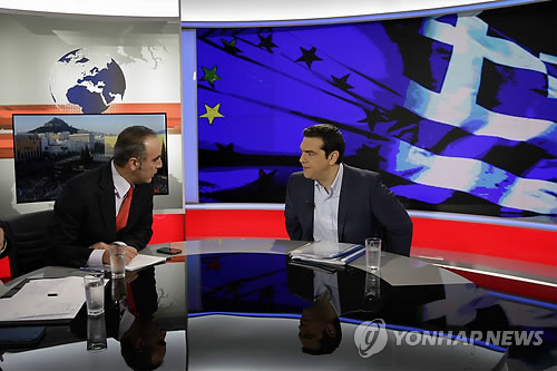 | △ 치프라스 총리, 사퇴 배수진 치고 구제금융안 거부 촉구 (아테네 AP=연합뉴스) 알렉시스 치프라스 그리스 총리가 29일(현지시간) 그리스 공영방송 ERT와의 인터뷰에서 다음 달 5일로 예정된 구제금융 협상안 국민투표에서 채권단의 지원 조건을 거부할 것을 촉구했다. 치프라스 총리는 구제금융안에 대한 반대투표가 강하면 강할수록 협상에서 그리스 입지도 강해질 것이라고 주장하고 국민투표에서 구제금융안이 받아들여지면 자신은 총리직에서 사퇴할 수 있음을 시사했다. 사진은 치프라스 총리(오른쪽)가 공영방송 ERT와 인터뷰하고 있는 모습. marshal@yna.co.kr |