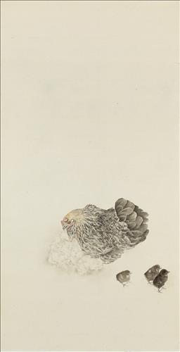 작품 '흰 그림자로만 존재하는 것'에선 닭이 품고 있는 여러 병아리의 윤곽이 선명하지 않고 희미하게 드러난다.