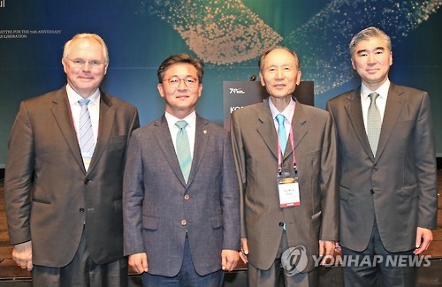 | △ 한반도 국제포럼 참석한 박재규 경남대 총장 (창원=연합뉴스) 박재규 경남대 총장(오른쪽에서 두 번째)은 30일 통일부와 경남대 극동문제연구소가 함께 서울 신라호텔에서 개최한 '2015 한반도 국제포럼'에 참석해 개회사에서 "분단 극복을 위한 남북관계의 새로운 비전을 제시해야 한다"고 강조했다. 박 총장이 크리스토퍼 힐 전 주한 미국대사(왼쪽), 홍용표 통일부 장관(왼쪽에서 두 번째), 성 김 미국 6자회담 수석대표(오른쪽)과 함께 기념촬영하고 있다. 2015.6.30 <<경남대>> bong@yna.co.kr |