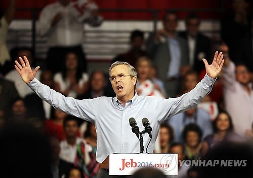 △ 젭 부시, 美 대선출마 선언 (마이애미 AP=연합뉴스) 미국 공화당의 유력 대선주자로 꼽히는 젭 부시 전 플로리다 주지사(62)가 15일(현지시간) "워싱턴을 뜯어고치겠다"며 2016년 대선 출마를 공식 선언했다. 공화당 주자 가운데 11번째. 41대 조지 H.W. 부시 전 대통령의 차남이자 43대 조지 W. 부시 전 대통령의 동생이다. 사진은 부시(가운데) 전 주지사가 이날 고향 플로리다주 마이애미 데이드 칼리지에서 출사표를 던지며 지지자들에게 손을 들어 보이는 모습. bulls@yna.co.kr Former Florida Gov. Jeb Bush waves to the crowd as he formally joins the race for president with a speech at Miami Dade College, Monday, June 15, 2015, in Miami. (AP Photo/David Goldman)