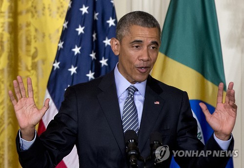 | △ President Barack Obama speaks during a joint news conference with Brazilian President Dilma Rousseff in the East Room of the White House in Washington, Tuesday, June 30, 2015. The president and visiting Brazilian President Dilma Rousseff sought Tuesday to cast their nations as "natural partners" collaborating closely on critical issues like climate and regional diplomacy, glossing over recent tensions over spying that have strained relations between the U.S. and Brazil. (AP Photo/Carolyn Kaster) |