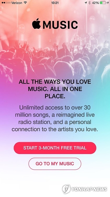 △ '애플 뮤직' 스트리밍 서비스 (쿠퍼티노<미국 캘리포니아주>=연합뉴스) 임화섭 특파원 = 전 세계 시가총액 제1위 기업인 애플이 6월 30일 오전 8시(현지시간) 가입형 음악 스트리밍 서비스 '애플 뮤직'을 개시했다. 애플은 이날 아이폰·아이패드·아이팟용 운영체제의 최신 업그레이드 버전인 iOS 8.4를 무료로 배포하면서 이를 설치한 100여 개국 사용자들이 애플 뮤직에 가입해 이를 쓸 수 있도록 했다. solatido@yna.co.kr