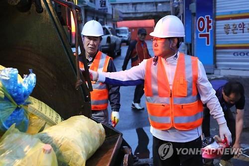 △ 일일 환경미화원 변신한 박세복 영동군수. <<연합뉴스 DB>>