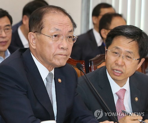 △ 논의하는 황우여 교육부 장관과 김재춘 차관 (서울=연합뉴스) 진성철 기자 = 황우여 교육부 장관이 1일 국회 교육문화체육관광위원회 전체회의에서 김재춘 차관과 논의하고 있다.