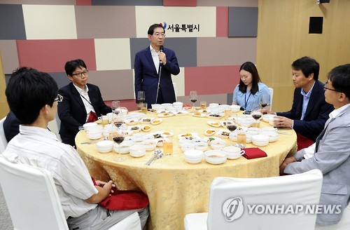 | △ 박원순 시장, 출입기자들과 오찬 간담회 (서울=연합뉴스) 박원순 서울시장이 민선 6기 1주년을 맞아 1일 서울시청에서 출입기자들과 오찬을 갖고 인사말을 하고 있다. 2015.7.1 << 서울시 제공 >> photo@yna.co.kr |
