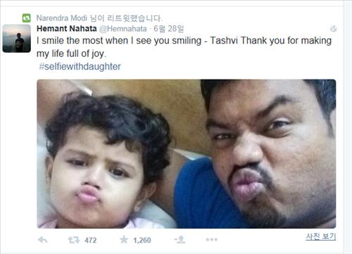 △ 나렌드라 모디 인도 총리가 자신의 트위터 계정에 리트윗한 '딸과 함께 셀카'사진.<<나렌드라 모디 총리 트위터 캡처>>