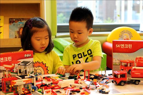 이 장난감은 200여개 블록으로 구성돼 있으며 조립하면 SK 유조차 모형이 된다.