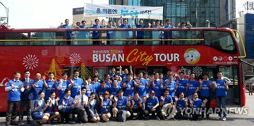 | △ (부산=연합뉴스) 서병수 부사시장을 비롯한 지역관광업계 인사 등 100여 명으로 구성된 부산관광 홍보단이 2일 지붕이 없는 2층 부산시티투어버스를 타고 서울 시내 일대에서 '올 여름엔 부산 가자'란 주제로 대규모 부산관광 로드쇼를 펼치고 있다. 이들은 할인 쿠폰북과 부산관광 홍보물을 나눠주며 수도권 관광객을 부산으로 유치하는 활동을 벌였다. 2015.7.2 << 부산관광공사 >> ccho@yna.co.kr |