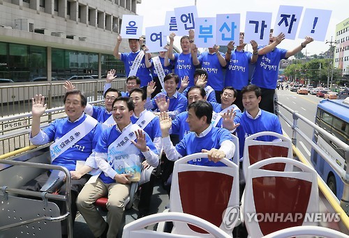| △ (서울=연합뉴스) 새누리당 김무성 대표와 지역 국회의원 등이 2일 오후 서울역에서 열린 '올 여름엔 부산가자' 캠페인에서 부산시티투어 버스를 타고 홍보활동을 하고 있다. << 부산관광공사 제공 >> 2015.7.2 leesh@yna.co.kr |