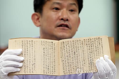 △ 2013년 8월 8일 박한용 민족문제연구소 교육홍보실장이 서울 성북구 안암동 고려대학교에서 공개된 일본군위안소 조선인 관리자의 일기를 들어보이고 있다. 이 일기는 지난 1942년부터 1944년 말까지 버마(현 미얀마)와 싱가포르의 일본군 위안소에서 일하던 한 조선인이 작성한 것으로, 일본군위안소의 경영 실태와 일본군위안부의 생활상 등이 담겨 있다. 또 일본군이 일본군위안부를 여러 차례 조직적으로 동원한 사실 등도 남겨져 있다. (연합뉴스 자료사진)