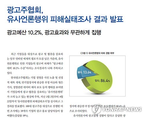 | △ 광고주협회, 유사언론행위 피해실태조사 결과 발표 (서울=연합뉴스) 기사를 무기로 기업과 기관을 협박하고, 끊임없는 베끼기와 제목 낚시질을 일삼는 사이비 언론이 활개를 치지만, 대책은 마땅찮다. 사이비 언론의 공갈과 협박 탓에 온국민이 피해를 보는 만큼 더는 방치하지 말고 근본 대책을 마련해야 한다고 전문가들이 입을 모았다. (한국광고주협회 홈페이지) |