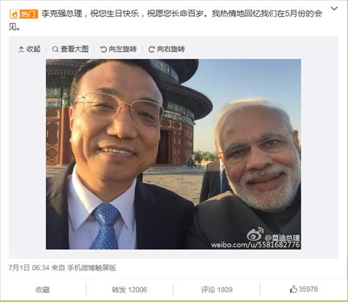 모디 총리는 1일 리커창(李克强) 중국 총리의 생일을 맞아 중국 최대 SNS인 웨이보 계정에 "리커창 총리, 생일 축하합니다. 장수를 축원합니다. 나는 지난 5월 회견을 따뜻하게 기억합니다"는 글을 중국어로 남겼다.