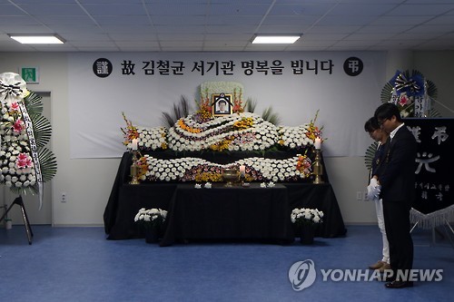 | △ 광주시청에 마련된 중국 버스사고 공무원 빈소 (광주=연합뉴스) 2일 오후 광주시청 1층에 마련된 광주광역시 소속 공무원 김철균 서기관의 분향소에서 광주시 소속 공무원들이 조문객을 받고 있다. 김철균 서기관은 지난 1일 중국 지린(吉林)성 지안(集安)에서 발생한 한국 연수 공무원 버스 추락 사고로 희생됐다. << 광주유니버시아드조직위 >> hkmpooh@yna.co.kr |