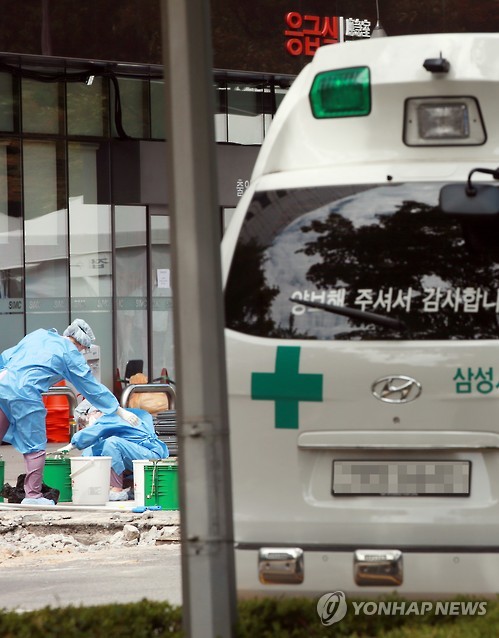 | △ 삼성서울 메르스 환자 12명, 국립의료원 등으로 이송 (서울=연합뉴스) 박동주 기자 = 3일 오후 강남구 일원동 삼성서울병원 응급실 앞에서 관계자들이 방역 작업 등을 하고 있다. 이날 삼성서울병원에서 중동호흡기증후군(메르스) 치료를 받는 환자 15명 가운데 12명이 국립중앙의료원과 서울시 보라매병원 등으로 옮겨진다. 2015.7.3 pdj6635@yna.co.kr |
