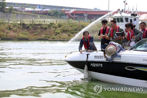 | △ 한강 녹조 점검하는 박원순 서울시장 (서울=연합뉴스) 신준희 기자 = 박원순 서울시장이 5일 오전 녹조로 오염된 서울 한강 하류를 점검하고 있다. hama@yna.co.kr |