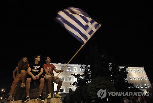 △ 신타고그 광장에 나부끼는 그리스 국기 (아테네 EPA=연합뉴스) 채권단 제안에 대한 그리스 국민의 찬반을 묻는 투표가 치러진 5일(현지시간) 반대가 압도적이라는 결과가 나오자 아테네 신타고그 광장에서 반대 지지자들이 국기를 흔들고 있다. 2010596@yna.co.kr