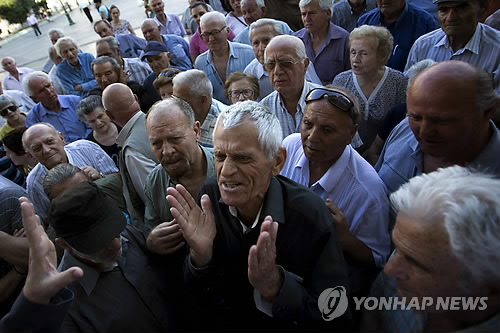 | △ 연금 좀 빨리 받자구 (아테네 AP=연합뉴스) 그리스가 전날 국제채권단의 구제금융안에 대한 국민투표에서 '반대'를 선택한 가운데, 6일(현지시간) 아테네의 한 은행지점에 연금을 지급받기 위해 몰려든 노인들이 직원에게 문을 열도록 요구하고 있다. 그리스는 국제통화기금(IMF) 채무불이행 사태에 따른 자본통제 조치로 현금카드와 신용카드가 없는 수급자는 120유로(약 15만원), 카드가 있는 수급자는 60유로를 각각 주간 단위로 지급하고 있다. 한편 채권단과의 협상 실무 총책임자였던 야니스 바루파키스 재무장관은 이날 전격적으로 사임 의사를 밝혔다. '비호감 파트너'인 자신이 물러남으로써 채권단에 협상을 압박하기 위한 조치로 풀이된다. bulls@yna.co.kr |