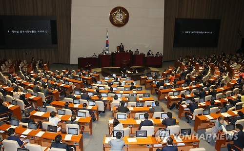 △ 국회법 개정안 재의안 본회의 상정 (서울=연합뉴스) 진성철 기자 = 6일 국회 본회의에서 국회법 개정안 재의안이 상정되고 있다.