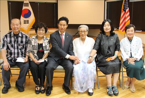 | △ 루시 백 시카고 위안부 피해 소녀상 건립추진위원장(왼쪽 두번째)이 김복동 할머니 피해 증언 행사 후 피터 백 한인회이사장, 서정일 한인회장, 김복동 할머니, 윤미향 한국정신대문제대책협의회 상임대표, 조봉완 전 조지타운대교수와 기념촬영하고 있다. |