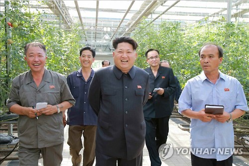 △ 북한 김정은, 평양 채소과학연구소 시찰 (서울=연합뉴스) 김정은 북한 국방위원회 제1위원장이 평양 채소과학연구소를 현지시찰하고 아득하게 펼쳐진 온실들이 너무 멋있다며 칭찬을 아끼지 않았다고 북한 노동신문이 7일 보도했다. 2015.7.7 nkphoto@yna.co.kr