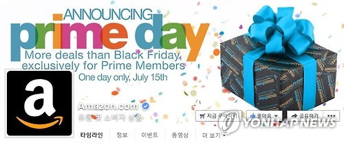 | △ 아마존 프라임 데이 (샌프란시스코=연합뉴스) 임화섭 특파원 = 인터넷 쇼핑몰 아마존이 오는 15일(현지시간)에 미국·오스트리아·프랑스·독일·이탈리아·일본·스페인·영국 등 8개국에서 자사 프라임 회원들을 대상으로 '프라임 데이' 할인행사를 열기로 했다. 2015.7.8. solatido@yna.co.kr |