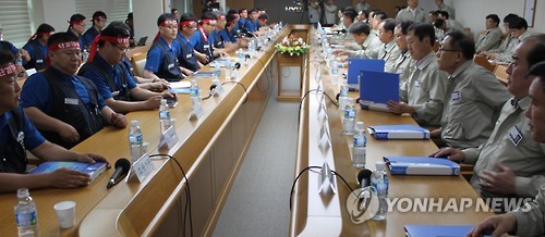 △ 현대차 노사 2015 임단협 첫 상견례 (울산=연합뉴스) 장영은 기자 = 현대자동차 노사는 2일 울산공장 아반떼룸에서 윤갑한 사장과 이경훈 노조위원장(지부장) 등 노사 교섭대표 50여 명이 참석한 가운데 올해 임금과 단체협약 교섭을 위한 첫 상견례를 열었다.2015.6.2 young@yna.co.kr