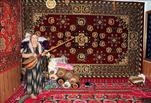 | △ (투르판=연합뉴스) 권수현 기자 = 중국 신장위구르자치구 투르판의 위구르족 가정 안방. 안주인이 위구르 전통악기 '두타르'를 들어 보이고 있다. 2015.6.26. inishmore@yna.co.kr |