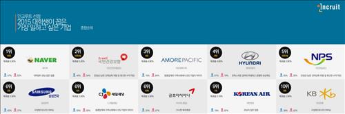 취업포털 인크루트는 회원 2천695명을 대상으로 실시한 '2015 대학생이 가장 일하고 싶은 기업' 조사에서 160개 기업 중 네이버가 응답률 6.3%로 1위에 올랐다고 9일 밝혔다.